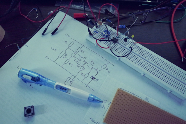 Le fait est que souvent ces instruments disposent d'une LED battant la mesure, ceci peut être exploité à l'aide du module doepfer A-179 Light Controlled Voltage Source http://www.doepfer.de/a179.htm , mais il n'est plus produit et introuvable. Alors je me le suis fabriqué pour synchroniser ma minipops